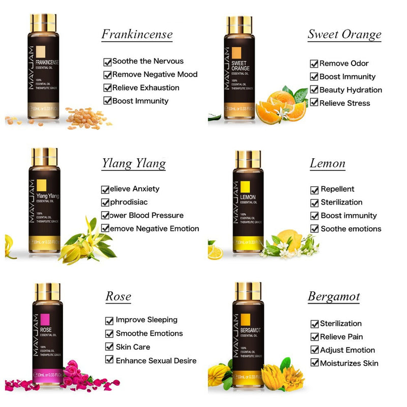 - VERSATILE AROMATHERAPY OILS: These pure and natural essential oils can be used in many ways, individually or in blends. It can be used in diffuser, humidifier, for aromatherapy, skin & hair care, massage, natural perfumery, baths, Ayurveda, saunas and air freshening, or to make soaps, bath bombs, scented candles and lip gloss.